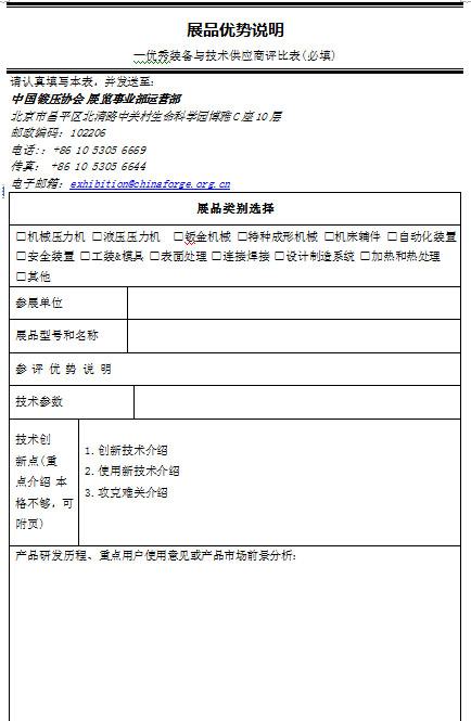 第一步:裝備展商自愿參加評選,免費評審,不收取任何費用。需要在開展之日起前45天提交《展品清單征集——優(yōu)秀裝備供應商推薦》和《展品清單征集——優(yōu)秀裝備供應商推薦》表格至中國鍛壓協(xié)會金屬成形展事業(yè)部運營部;