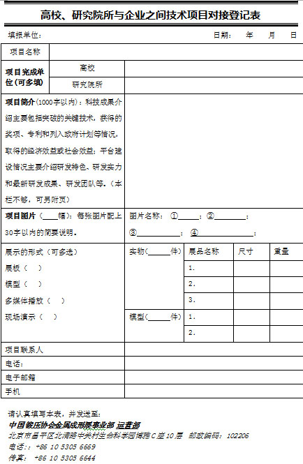 歡迎展商推廣本活動。如果大專院校和研究院所需要參加,請認真填寫《↓ 高校、研究院所與企業之間技術項目對接登記表文件預覽